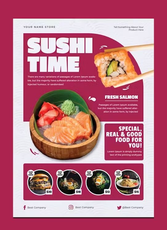 Aturan nomor satu dalam mendesain flyer restoran adalah: manusia makan dengan mata mereka terlebih dahulu. Sebelum seseorang membaca satu kata pun, gambar hidangan andalan Anda-lah yang akan menjadi penentu. Sebuah foto makanan yang berkualitas buruk, gelap, atau tidak fokus bisa membuat hidangan paling lezat sekalipun terlihat tidak menarik. Oleh karena itu, berinvestasi pada fotografi makanan profesional bukanlah sebuah kemewahan, melainkan sebuah keharusan. Foto yang berhasil adalah foto yang mampu bercerita. Bayangkan gambar keju mozarella yang meleleh dan ditarik dari sepotong piza, uap yang mengepul dari semangkuk sup panas, atau kilauan saus barbeku pada iga bakar yang baru diangkat dari panggangan. Gambar-gambar inilah yang memicu reaksi visceral, mengaktifkan imajinasi rasa, dan membuat perut pembaca keroncongan seketika. Jadikan foto ini sebagai "pahlawan" dalam desain Anda, berikan ruang yang paling dominan dan biarkan ia melakukan tugasnya.