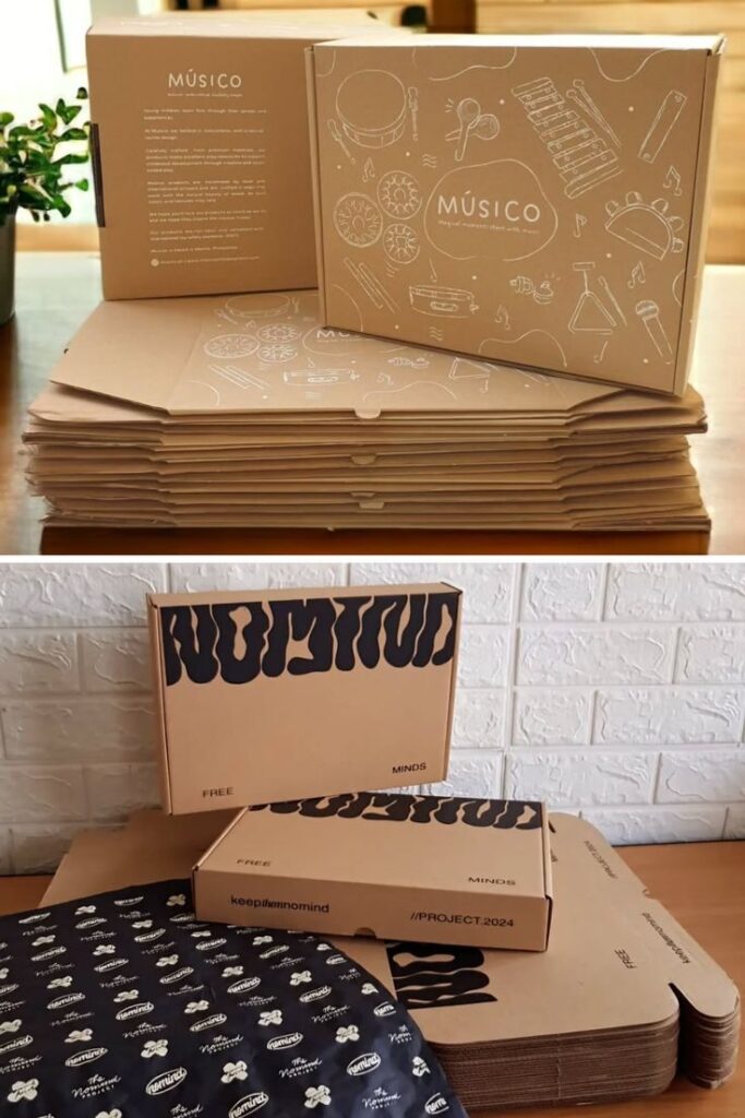 Salah satu tantangan sekaligus pesona terbesar dari box corrugated adalah permukaannya yang khas berwarna cokelat kraft. Alih-alih menutupinya, manfaatkanlah karakter ini untuk menciptakan desain packaging stylish yang otentik. Salah satu tren terkuat saat ini adalah desain minimalis dengan menggunakan satu atau dua warna tinta saja. Bayangkan logo Anda dicetak dengan tinta hitam pekat atau putih bersih di atas permukaan cokelat yang natural. Hasilnya adalah tampilan yang industrial, organik, modern, dan sangat berkelas. Pendekatan ini tidak hanya terlihat keren, tetapi juga sangat efisien dari segi biaya cetak. Cetak box corrugated dengan desain sederhana namun tegas menunjukkan kepercayaan diri merek dan memungkinkan tekstur alami dari kardus itu sendiri menjadi bagian dari estetika desain.